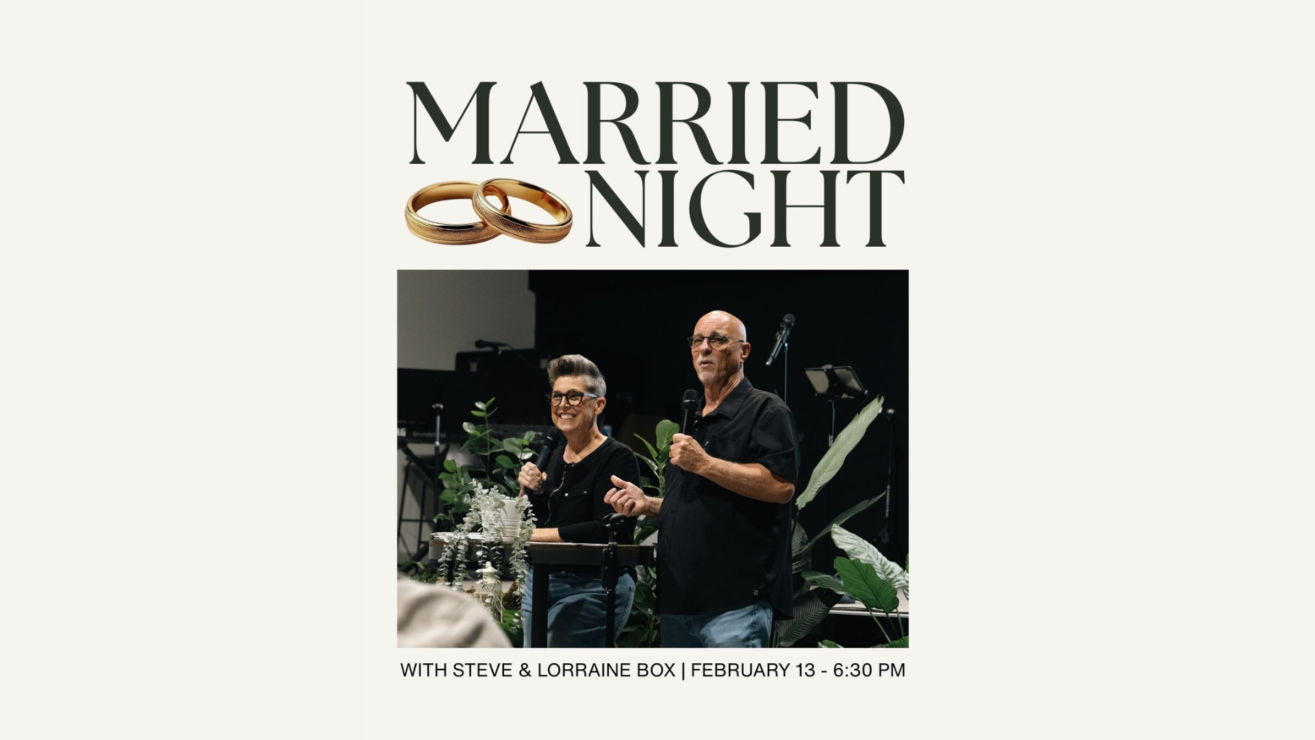 oin us on February 13th at 6:30 PM as we hear from Steve and Lorraine Box, who bring years of wisdom and heart for helping marriages grow healthy and strong. Come ready to receive, connect with other couples, and enjoy a meaningful night with your spouse.