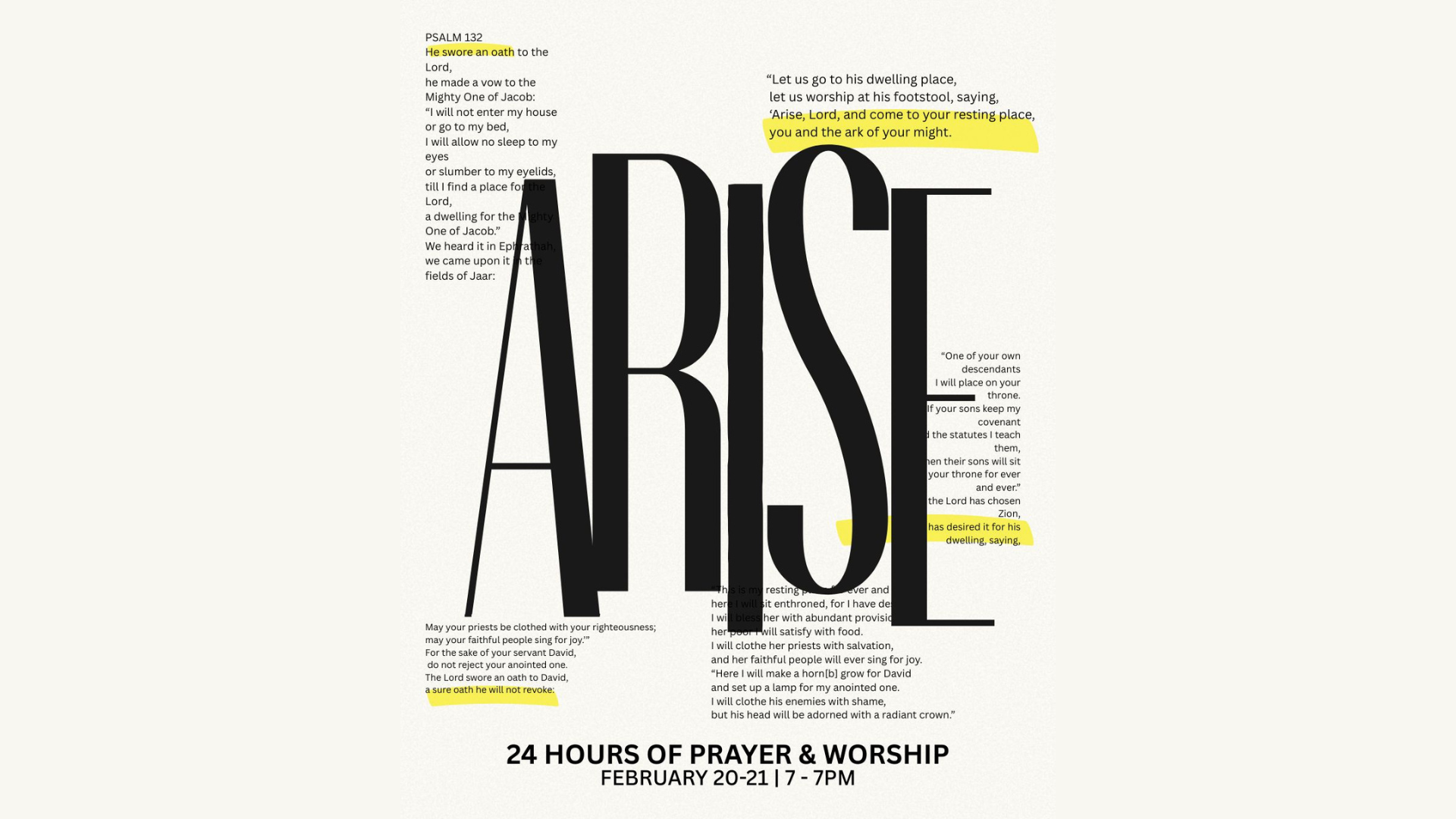 Arise is almost here! From February 20th at 7 PM through February 21st at 7 PM, join us for our 24-hour time of worship. Come and go as you’re able as we create space to worship the Lord together.